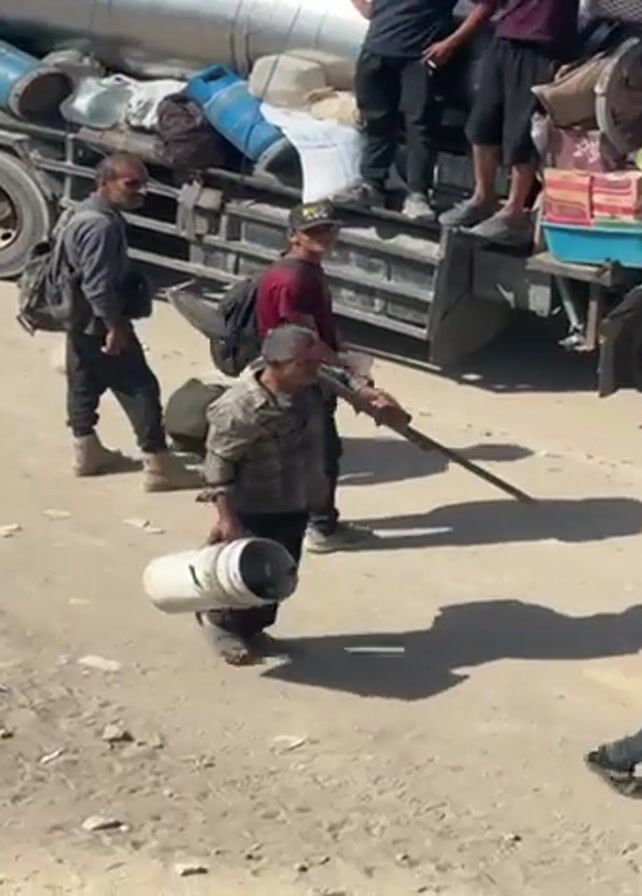 The video depicts a man carrying a white bucket and a shovel, with a backpack slung over his shoulder. He is walking past a truck, with additional people on the flatbed. The ground appears dusty or sandy. The truck is loaded with various items including containers, bags, and boxes. The background features other vehicles and indistinct signs or banners.