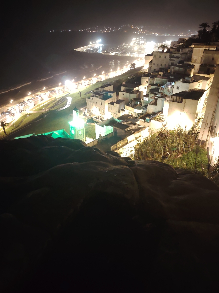 A nighttime view shows a coastline city illuminated by streetlights. A line of traffic moves along the shore. White buildings with flat roofs cluster on a hillside, some lit from within. A green-lit mosque stands prominently near the shore. Dark, rocky terrain dominates the foreground. Distant lights suggest more city beyond.
