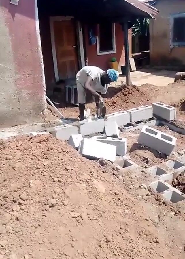 person laying concrete blocks on a dirt ground. The person is wearing a light-colored shirt and shorts and a blue head covering. They are bending over and using a tool to place the blocks. There are several concrete blocks already laid down in a pattern. In the background, there is a small, red building with a porch. There is also a second building in the background. The sky is blue and there are some trees visible.