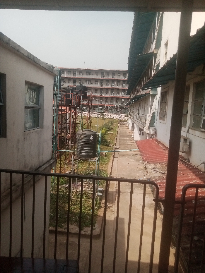 The image displays an outdoor scene within an institutional or large residential complex in Ibadan, Nigeria, viewed from an elevated position behind a dark metal railing. To the left, the stained, light-colored facade of a building features two rectangular windows with aged frames. Central to the midground is a system of black plastic water tanks of varying sizes, supported by tall, multi-tiered, rusty red metal scaffolding. Blue and green PVC pipes connect these tanks. The ground beneath the tanks and extending along a path consists of sparse green vegetation and exposed earth. To the right, a long, white-painted multi-story building is visible, featuring numerous windows, some with external air conditioning units, and a green-colored awning or roof extension. Below this, a section of aged, red corrugated metal roofing is evident. A concrete or paved pathway traverses the scene between the buildings. In the distant background, a large, multi-story structure, at least six floors high, stands prominently. This building is light-colored and characterized by repetitive window and balcony designs along its visible side. The sky above is bright and hazy. No individuals are present in the scene.