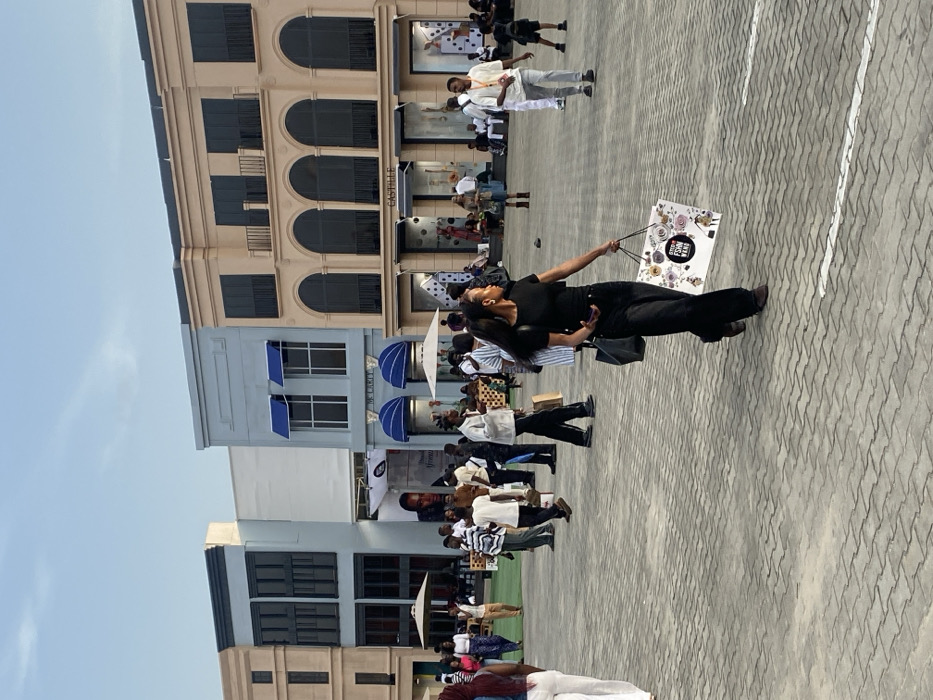 The image depicts an active outdoor pedestrian square in Itirin, Nigeria, during daylight hours under a clear sky