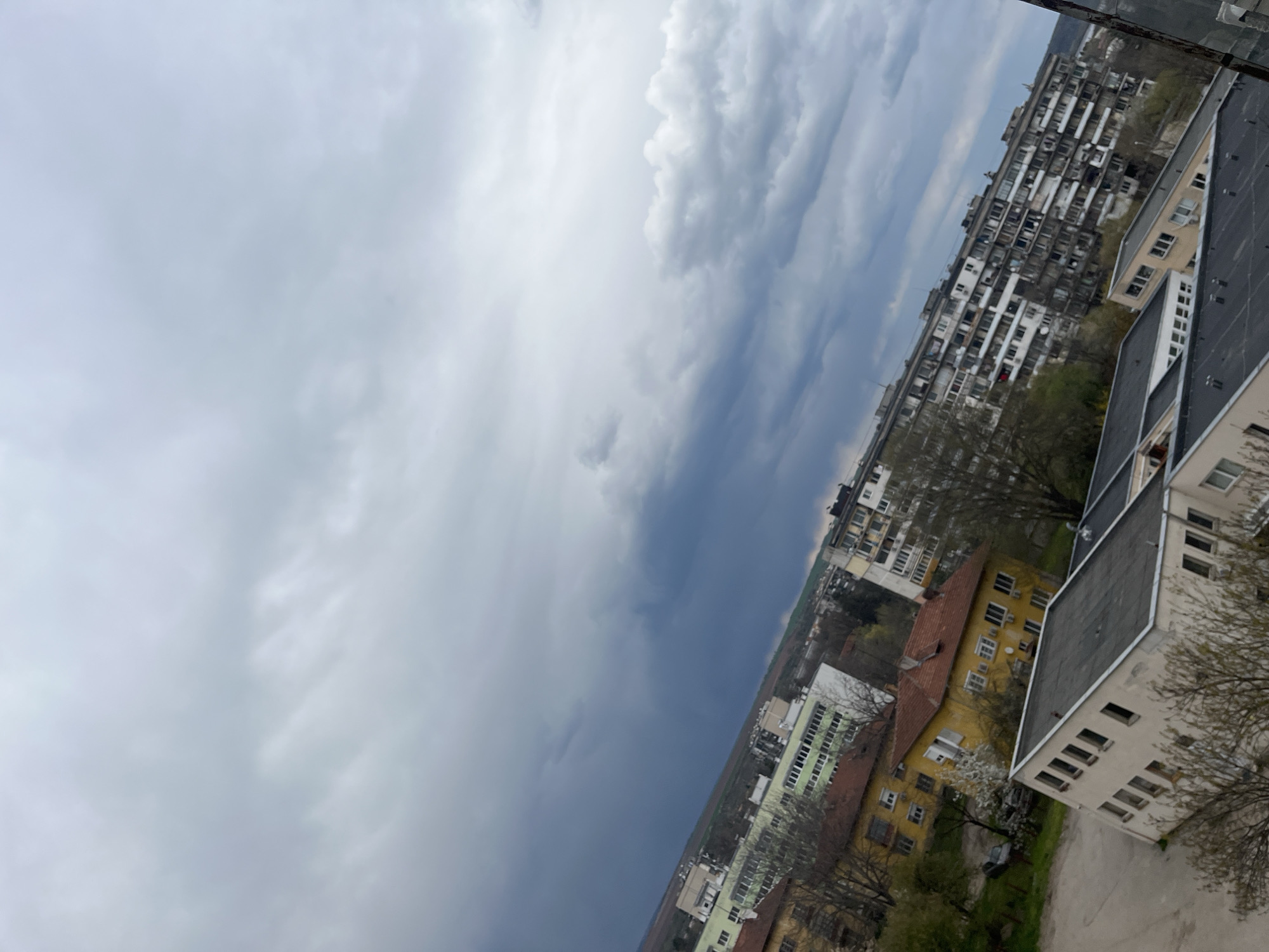 The image presents an elevated perspective of an urban landscape under an overcast sky. The sky is dominated by thick, grey clouds, suggesting an impending storm or a generally gloomy weather pattern. Below the sky, the scene is filled with buildings of varying heights and architectural styles. Several tall, multi-story apartment complexes are visible, characterized by rows of windows and simple geometric designs. A school is located in the foreground, and a few trees are seen throughout the scene, primarily in the vicinity of the buildings. The time of year is likely early spring, as the trees are just beginning to sprout new leaves. The location is unknown.