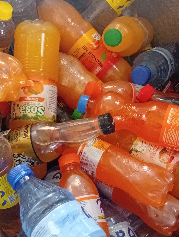 The scene depicts a dense accumulation of assorted plastic beverage bottles, located within Zango, Nigeria. The majority of the bottles are made of clear polyethylene terephthalate (PET) plastic. A significant portion contains an orange-colored liquid, consistent with juice or a soft drink. Visible labels include "Sosa ORANGE FRUIT DRINK" on one prominent bottle, "RECYCLE ME" on another bottle with a green cap, and "PREDATOR ENERGY" on a gold-labeled bottle. Several bottles contain clear liquid, presumed to be water, and are topped with blue caps. Additional cap colors observed are red, orange, and black. The bottles are haphazardly stacked and intertwined, indicative of discarded containers at a collection point. No individuals or specific actions are discernible within the frame; the focus is solely on the static cluster of bottles.