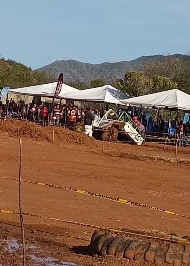 dirt track with a crowd of people watching an off-road buggy. The buggy is white and green and is positioned on a muddy track with some tires and other obstacles. There are people standing around the buggy, possibly assisting or inspecting it. The crowd is gathered under white tents and behind yellow caution tape. In the background, there are hills and a clear, bright sky. The ground is a mix of dry dirt and muddy patches.