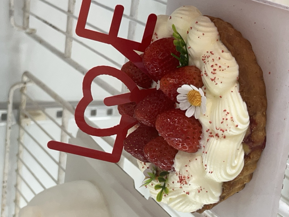 A partially visible strawberry tart, decorated with whipped cream and small red sprinkles, sits in a white cardboard container. The tart features a cluster of fresh strawberries, a small white daisy, and some green foliage. A red "Love" topper with a heart in the middle is placed on top of the tart. The tart is positioned next to a white wire rack.