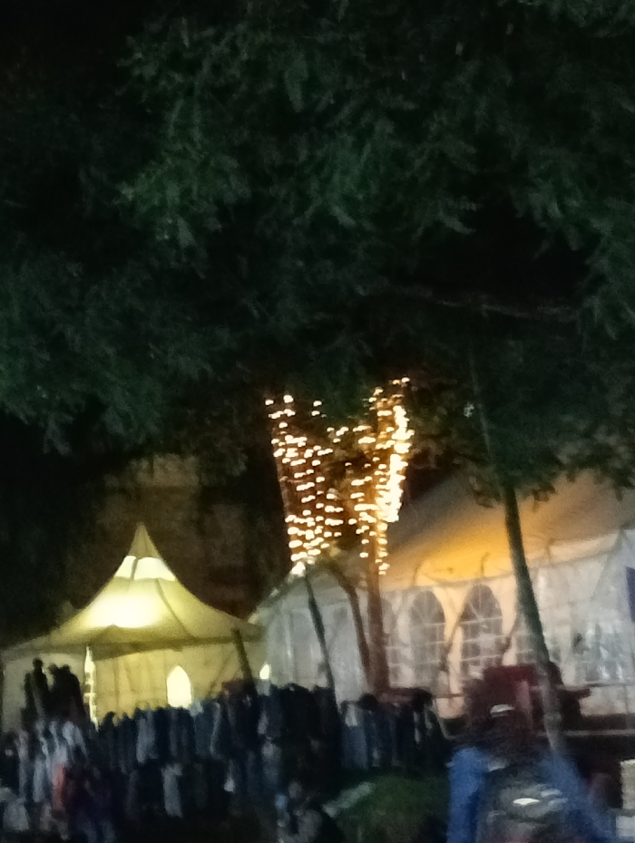Two tents stand illuminated at night, surrounded by a crowd of silhouetted figures. A tree adorned with twinkling lights adds a festive touch to the scene. The image is partially obscured by dark foliage at the top, creating a sense of enclosure. The composition evokes an ambiance of celebration or event under the night sky.