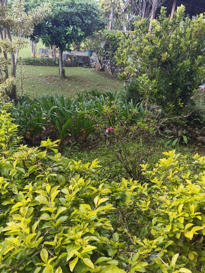 The image displays an outdoor garden area located in Akshatau, Kazakhstan. The scene is characterized by dense foliage under diffused lighting conditions. In the immediate foreground, a mass of bright yellowish-green shrubs with visible water droplets on their leaves fills the lower portion of the frame. Directly behind these, a bed of dark green, broad-leaved plants, arranged in clusters, occupies the midground. To the right of these plants, a smaller shrub with dark green foliage presents two distinct pink flowers. A manicured grass lawn extends from the midground into the background. A medium-sized tree with a full, rounded canopy of dark green leaves stands centrally on this lawn. Near the base of this tree, several orange flowers are visible on the grass. To the left, a tree with lighter bark and more sparse foliage is partially visible. On the right side of the midground, a low stone wall with a concrete cap supports a solitary blue planter pot. Further to the right, a large, dense, dark green bush partially obscures a wooden structure with a dark roof in the distant background. The overall environment consists entirely of cultivated plant life and ground features. No individuals or animals are present, and no actions or interactions are depicted.