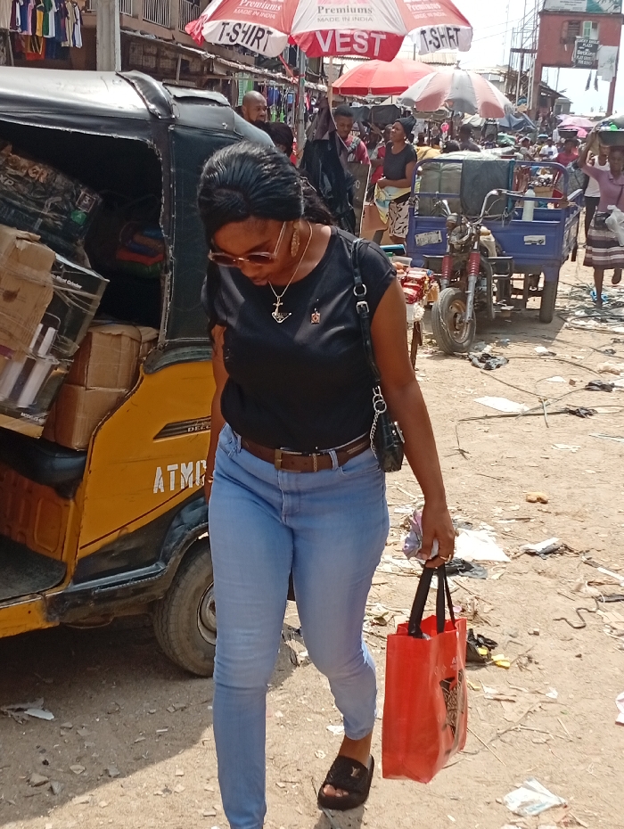A woman in a black top and light blue jeans walks through a crowded outdoor market. She carries a red shopping bag in her right hand. A brown belt cinches her waist. She wears black sandals and sunglasses. In the background, stalls are shaded by colorful umbrellas, and a yellow auto-rickshaw is parked nearby, loaded with boxes. The ground appears dusty and littered with debris. Other people are walking through the market.