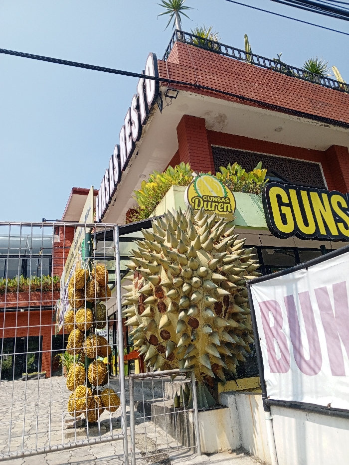 This image captures the exterior of Gansas Resto, a commercial establishment located in Bayawan, Philippines. The multi-story building features a prominent red brick facade on its upper section, topped with a flat roof that incorporates a black railing and several potted plants, including a distinctively tall, spiky succulent. A large, light-yellow and brown durian fruit sculpture, characterized by numerous spikes, stands on a raised platform in the foreground. To the left of this sculpture, behind a gray metal fence, multiple clusters of yellow durian fruits, either real or highly realistic replicas, are vertically displayed. The building's signage includes "GUNSAS RESTO" in white illuminated letters along the upper edge, a circular sign below it with "GUNSAS Duren" and a durian graphic, and a partially visible large yellow sign displaying "GUNS." A white banner with partial purple text "BUN..." is present on the right side of the foreground. Overhead, black electrical wires traverse the scene against a clear blue sky. The ground level in the immediate vicinity appears to be paved. No individuals are present.