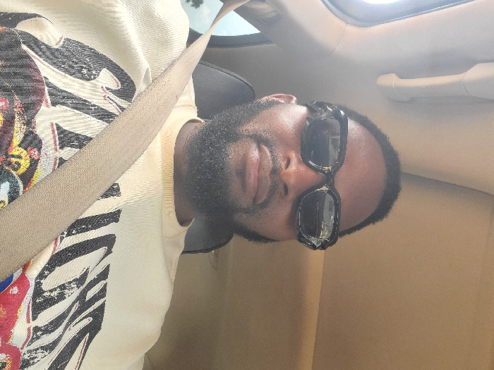 The image displays an adult male seated inside a vehicle, facing the camera. The individual has a dark complexion, a short dark haircut, and a full dark beard. He is wearing dark, rectangular-framed sunglasses with a textured or faceted design on the frames. His clothing consists of a light-colored, possibly cream or light yellow, long-sleeved shirt featuring a large graphic print with black text and colorful imagery that appears to depict billiard balls. A beige seatbelt is secured diagonally across his right shoulder and chest. The visible car interior includes a dark seat headrest behind the subject, a light beige headliner above, and a white grab handle on the passenger side ceiling. A bright light source is visible to the upper left, indicating a window, with indistinct green foliage faintly visible outside. There are no specific visual identifiers within the image to determine a precise location in the city of Jos, Nigeria.