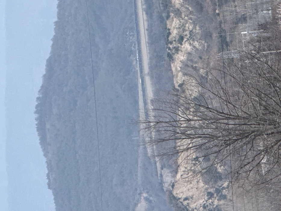 The image depicts a hazy, expansive view of a mountainous and hilly landscape located in the city of Kresna, Bulgaria. In the immediate foreground, a large, multi-trunked deciduous tree stands centrally, completely devoid of foliage, its numerous bare branches extending upwards. Multiple thin, dark utility lines run horizontally across the lower section of the frame, partially obscured by the tree. The midground features an undulating terrain. To the left, a prominent, light-colored hillside displays significant erosion with exposed sandy or light brown soil, interspersed with sparse patches of dark green vegetation. Further back, a dark, linear strip, consistent with a road or a cleared path, traverses horizontally across the middle of the scene. A small, light-colored, elongated object, possibly a vehicle, is faintly visible on this strip. Towards the lower right, partially concealed by the foreground tree, are indistinct structures, potentially industrial or utility buildings, accompanied by additional bare trees and a tall, slender metallic utility tower. The background is dominated by a large, rounded mountain or substantial hill, densely covered with leafless trees, presenting a muted blue-grey appearance, indicative of distance and atmospheric haze. The uppermost portion of the image shows a pale, uniform blue-grey sky. No individuals or direct human actions are discernible within the scene. The leafless trees suggest the season is late autumn, winter, or early spring.