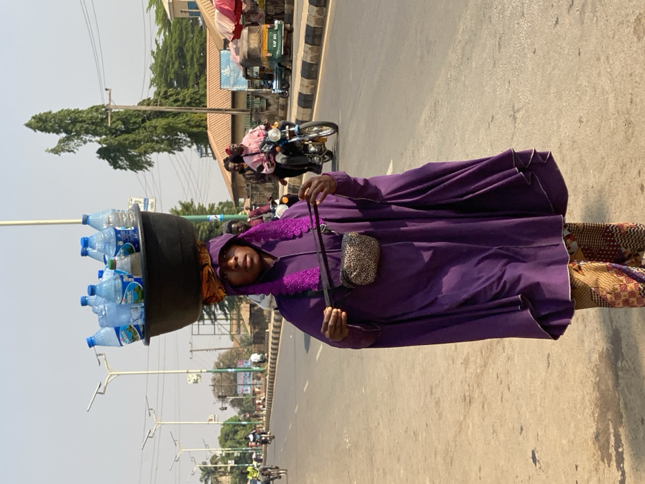 In Kafanchan B, Nigeria, a person walks on the edge of an asphalt road under clear daylight. The individual, dressed in a long, dark purple garment over patterned trousers and an orange headwrap, carries a black basin filled with approximately eight plastic water bottles on their head. They also wear a small, patterned pouch around their neck, holding its black strap with both hands. In the background, to the right, two individuals ride a motorcycle on the road, while a green and yellow three-wheeled vehicle with a "KAF 103" license plate is parked further down. On the left, streetlights equipped with solar panels line the road, and additional individuals and motorcycles are visible in the distance. Buildings with light-colored facades and some red roofs are present in the background, alongside various trees and utility poles. The road is bordered by a concrete median barrier.
