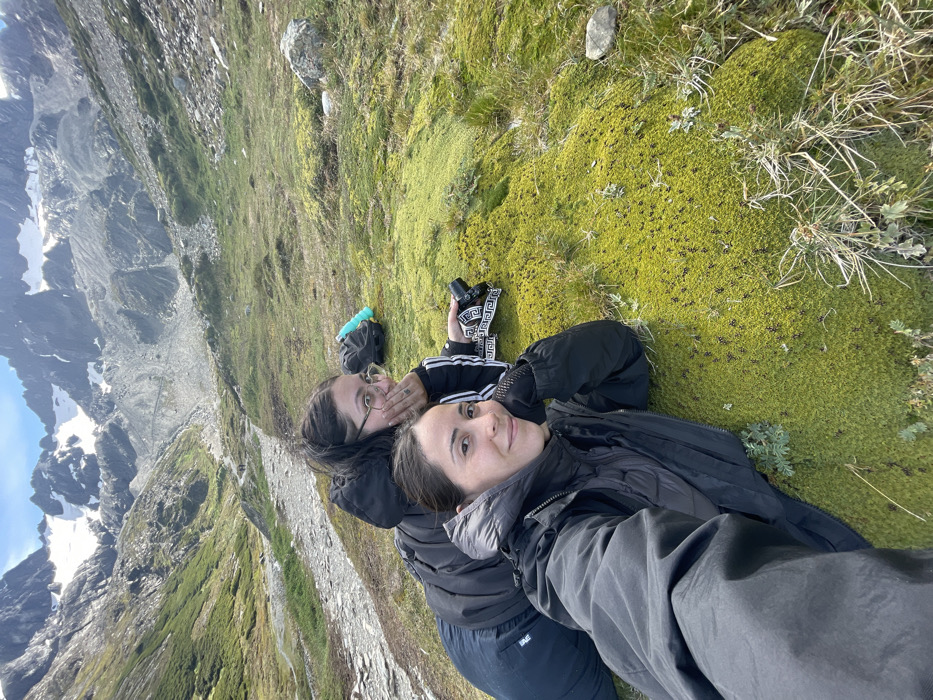 Two women lie on a mossy, rocky mountainside. The woman closer to the camera faces forward, wearing a dark jacket. The other woman, behind her, wears glasses and an Adidas track jacket, with her hand near her mouth. A camera with a patterned strap sits near them. Snow-capped peaks rise in the background, with green and gray vegetation on the slope. The perspective is tilted, taken at an angle from above.