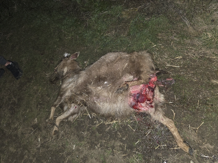A deceased deer lies on its side in a grassy and muddy area. The animal has sustained a large, gaping wound on its abdomen, exposing internal organs and blood. The deer's fur appears matted and dirty. A person's boot is visible in the upper left corner of the image. The overall scene suggests a violent or tragic event.