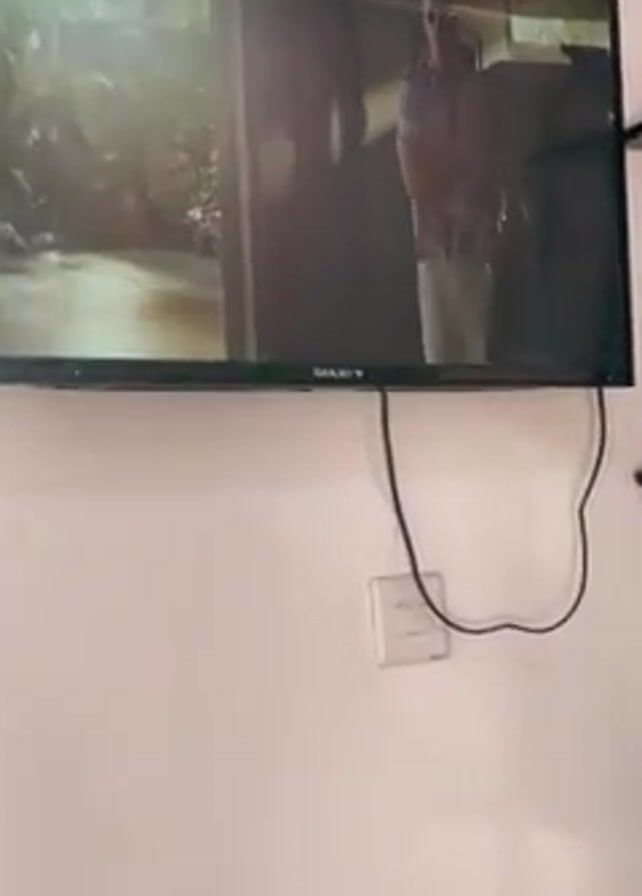 television mounted on a white wall. A man with sunglasses and a patterned shirt is on the screen, seemingly indoors and walking towards an open doorway or window that reveals a lush, bright outdoor setting. The TV is a "MAXI" brand. Below the TV, a power outlet and loose power cords are visible. To the right of the TV, there is a black shelving unit. Above the television a grey item is fixed to the wall.
