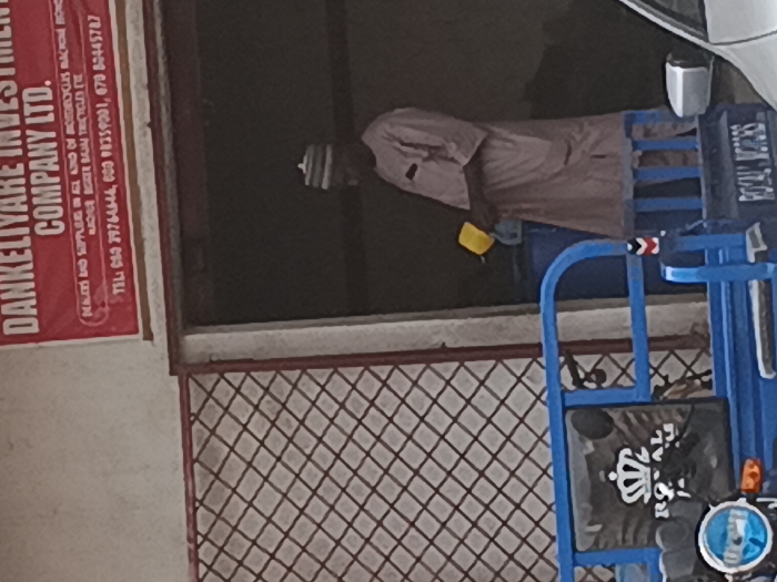 The image displays an outdoor daytime scene in front of a commercial building, location unknown. A prominent red banner above a doorway identifies the establishment as "DANKELIYA INVESTMENTS COMPANY LTD." and advertises "DEALERS AND SUPPLIERS IN ALL KIND OF MOTORCYCLES MACHINE BONES / KADUNA BOXER BAJAJ TRICYCLES ETC.," along with three contact telephone numbers. An adult male, dark-skinned, stands within the dark interior of the open doorway, visible from the chest upwards. He wears a light tan or beige tunic and a striped skullcap. He holds a yellow, possibly plastic, scoop or container at waist height. In the foreground, a blue three-wheeled vehicle, likely a tricycle or "Keke Napep," is partially visible, obscuring the lower half of the doorway. The vehicle features a black cover with a white crown logo and "ROYAL" text on its left side, and "ROYAL MOTORS" printed on a dark blue panel. Chevron-like markings are present on a vertical blue frame component. To the left of the doorway, a beige wall is partially covered by a dark-colored metal security gate or mesh. A small section of a white vehicle, likely a car, including a silver side mirror, is visible on the far right of the frame.