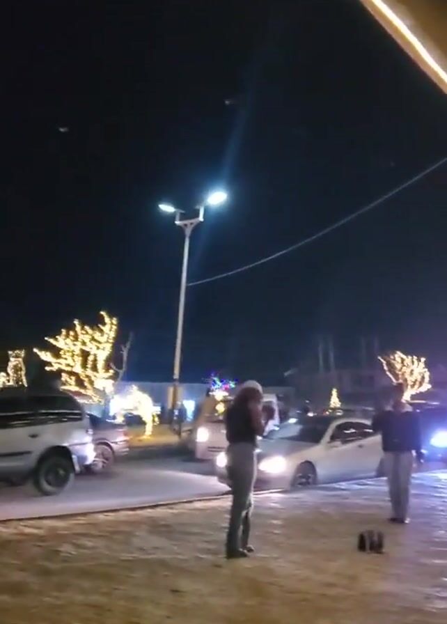 The video pans across a street scene at night under an overpass decorated with bright lights. Initially, a few people stand on a dirt patch near parked cars and streetlight-illuminated streets decorated with holiday lights. The camera moves under the overpass, where more people are seen. The overpass is painted with colorful murals and decorated with strands of lights. Some decorative lighting shaped like barrels sits near the pillars, and other ring-shaped hanging lights are strung across the overpass.
