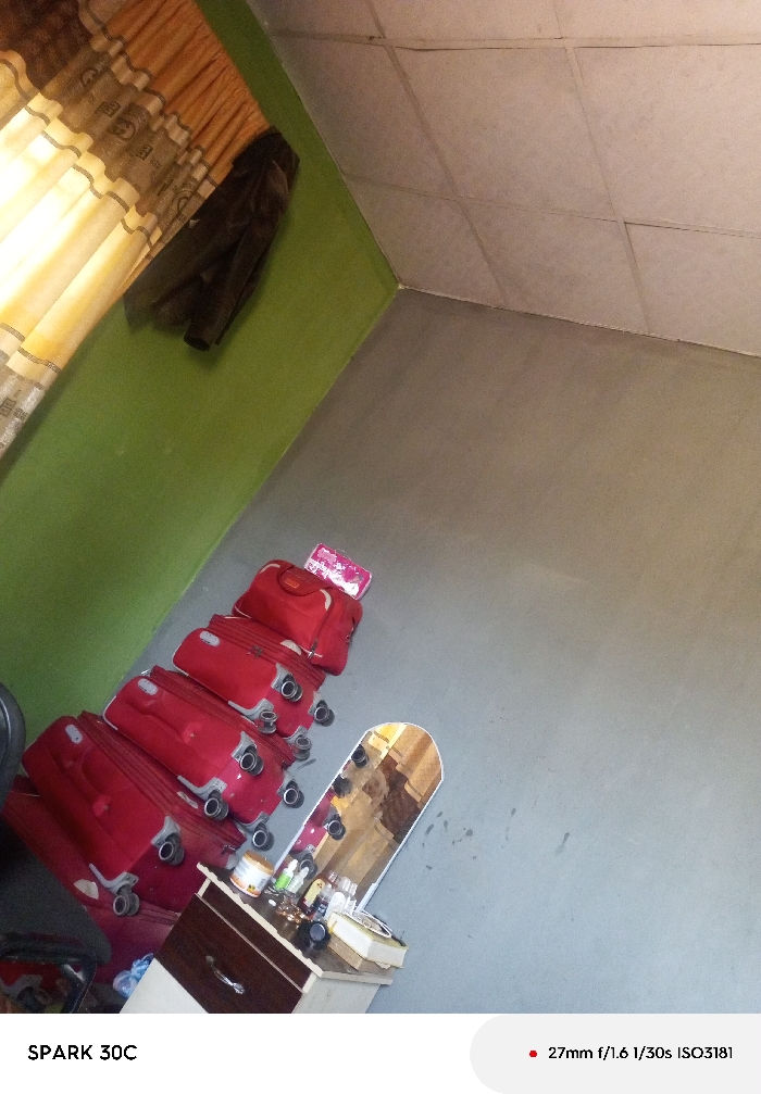 An interior room, location Unknown, Unknown, is depicted from an oblique, elevated perspective. The left wall is painted light green, meeting a plain grey wall and floor on the right. The ceiling features light grey square tiles. On the upper left, a window is partially obscured by a pulled-back, striped curtain primarily in yellow and brown tones. Below the curtain, a dark jacket or coat hangs against the green wall. Five red rolling suitcases are stacked vertically, increasing in size from smallest at the top to largest at the bottom, positioned along the corner where the green wall meets the grey floor. A small pink pouch or container rests on the top-most suitcase. To the right of the suitcases, a light-colored wooden dressing table with dark brown drawers holds an assortment of personal care products and a narrow, oval-shaped mirror. A dark chair or piece of furniture is partially visible in the bottom-left corner. No individuals are present in the scene.