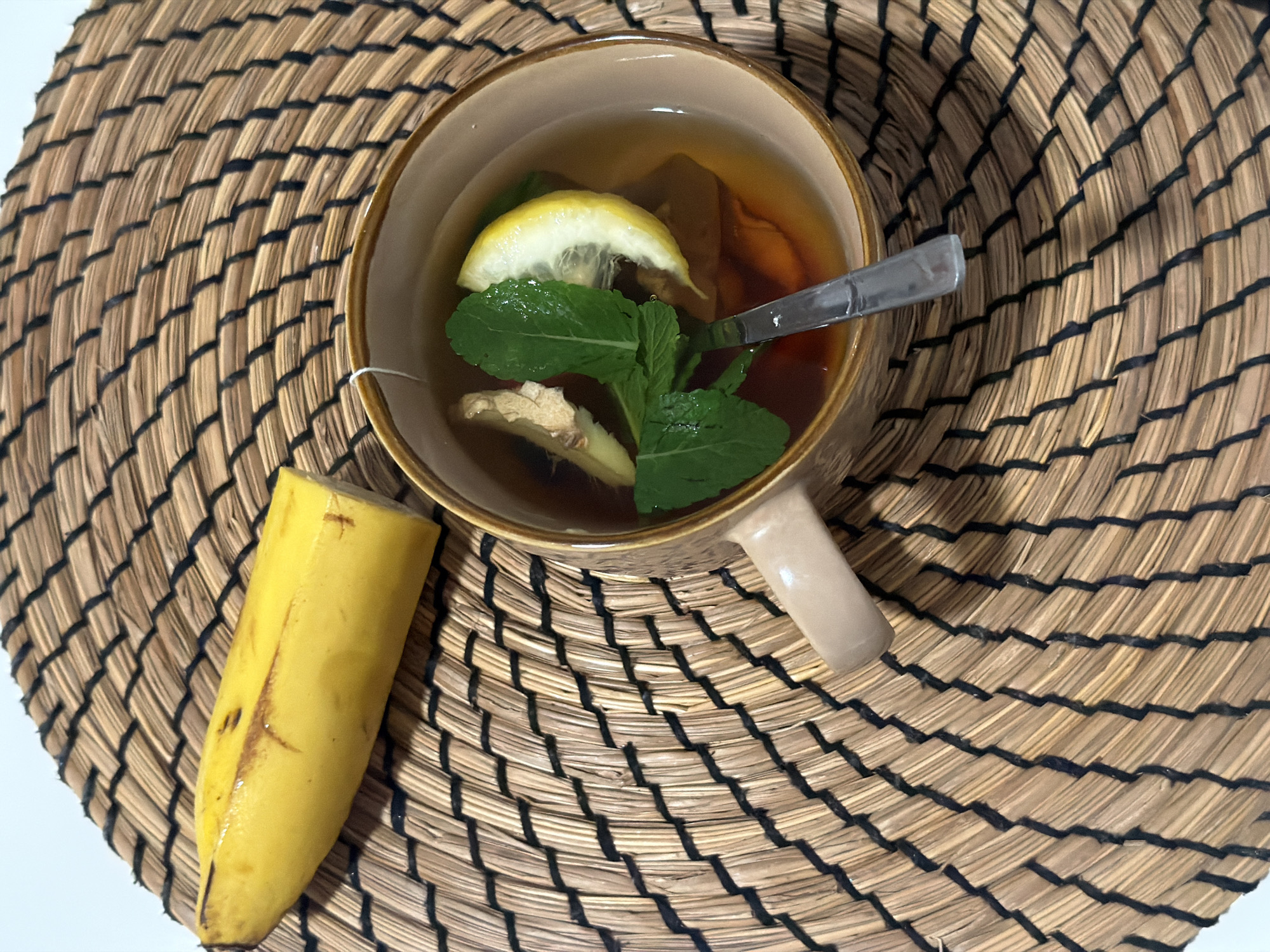 The image presents a top-down view of a domestic scene in Valencia, Spain. Centrally positioned is a beige ceramic mug with a visible handle, resting on a circular woven placemat. The mug contains a dark amber liquid. Immersed in the liquid are one silver-colored spoon, a single half-moon slice of yellow lemon, multiple green mint leaves, and two irregular pieces of light brown ginger root. A white string, consistent with that of a tea bag, extends from the liquid and hangs over the mug's rim. To the upper left of the mug lies a single, ripe yellow banana, horizontally cut, exposing its pale yellow interior. The banana's peel shows minor brown discoloration. The placemat features a tightly woven pattern of natural, light brown fibers interwoven with darker, possibly black, strands, creating a distinct diagonal zigzag design. A plain white surface is visible in the background, to the upper left of the placemat. No individuals are present in the frame.