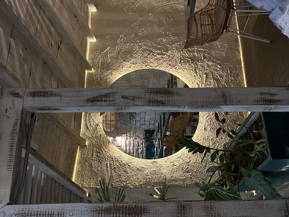 From below, a circular opening reveals a glimpse of another space with woven chairs and a teal door. The opening's frame is textured and illuminated with a warm glow. A weathered, white wooden structure surrounds the view. Green plants spill into the foreground, adding a natural element. The overall perspective is unique, creating a sense of depth and intrigue.