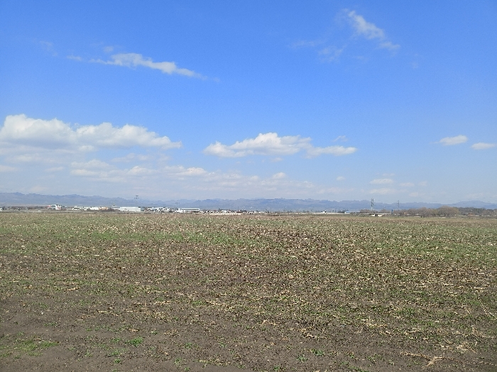 An expansive outdoor landscape captured on a clear day depicts an agricultural plain on the periphery of Sofia, Bulgaria. The foreground is dominated by a vast, flat field of dark brown earth interspersed with light brown stubble and nascent green growth, indicating a cultivated area in early spring or post-harvest. No individuals or immediate objects are present within this field. In the midground, a horizontal line of low-rise commercial or industrial buildings, primarily white and light grey structures consistent with warehouses or factories, mark the transition from the open field. Sparse, bare deciduous trees are visible among these structures, along with distant utility poles or communication towers. A segment resembling an overpass or bridge is discernible to the right. The background features a distant, hazy mountain range, likely part of the Balkan Mountains, Sredna Gora, or Vitosha, stretching across the horizon. The upper half of the image is a vibrant blue sky dotted with scattered, fluffy white cumulus clouds. The scene is uniformly illuminated by natural sunlight, suggesting clear daytime conditions with no visible actions or interactions occurring.