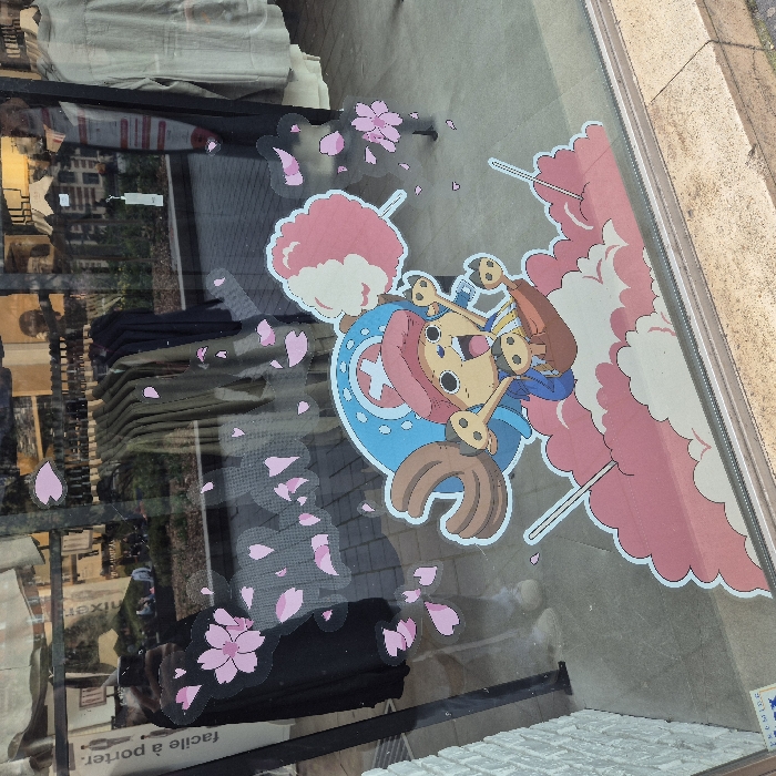 The image displays the large glass window of a retail shop located in Toulouse, France. Adhered to the window is a prominent, colorful sticker of Tony Tony Chopper from *One Piece*, depicted with wide eyes and an open mouth, appearing to leap or fly atop a base of stylized pink and white clouds. Chopper holds a large pink and white cotton candy on a stick. Surrounding the central figure are numerous smaller pink cherry blossom petal stickers, along with a larger cherry blossom cluster decal. Through the transparent and reflective glass, the shop's interior reveals racks of clothing, including multiple dark and olive-green garments on hangers, along with what appears to be a light-colored top on a mannequin or display to the far right. The exterior environment is significantly reflected on the window's surface. These reflections include: a person on the left side, partially visible, wearing a dark top and light-colored pants; faint reflections of distant trees and buildings; and a paved sidewalk. The French phrase "facile à porter" is legible in reflection on the upper left portion of the glass, suggesting the shop sells apparel. A small white security sticker with the text "SECURITE" is visible in the lower left corner of the window. Adjacent to the bottom left frame of the window, a section of light-colored brickwork is visible.