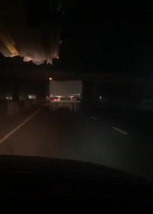 vehicle driving at night on a highway. In front of the vehicle, there is a large white truck, its taillights clearly visible. Above the road, an overpass casts a shadow over the scene. The road is divided by white lines, and the headlights of oncoming traffic are visible in the distance. The interior of the filming vehicle is dark, with only the dashboard slightly illuminated. The overall lighting is low, emphasizing the darkness of the night.