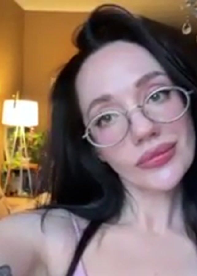 The scene appears to be a casual, self-shot video taken indoors. A woman with long, dark hair and glasses is positioned in the foreground. She is wearing a light-colored top with thin straps. Her skin has a fair complexion, and her lips appear to be slightly enhanced. A tattoo is visible on her left upper arm. The background includes a tan-colored couch, a painting with a cat design, a lamp, a television, and a chandelier. The lighting is a mix of natural light and artificial light. The walls are painted in warm tones. The woman is looking directly at the camera.