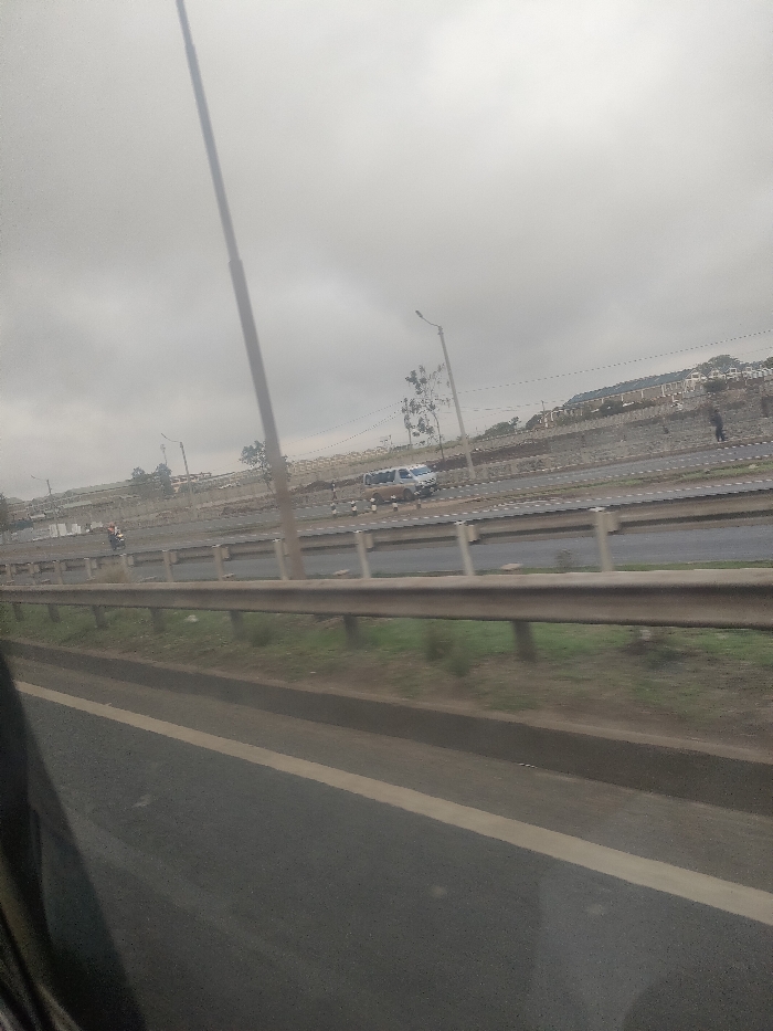 The image displays a multi-lane highway in Gatongora ward, Kenya, observed from within a moving vehicle under an overcast sky. In the immediate foreground, a dark asphalt road surface with a white lane marking is visible, bordered by a metal guardrail extending horizontally. Beyond the guardrail, a strip of green grass and dirt separates it from the further road sections. The mid-ground encompasses several asphalt road lanes, delineated by white dashed lines and separated by concrete barriers. A motorcycle (boda-boda) with two occupants is visible in one lane, moving towards the left of the frame. Further right, on a slightly elevated road section, a light-colored van is present near several small, white-and-black striped bollards. Two human figures are discernible on foot near the van, one positioned to its right and walking further right. Multiple tall utility poles, including a prominent central one and a streetlight with a curved arm, are spaced along the roadside. The background features an elevated terrain supported by a retaining wall, upon which various light-colored buildings with dark roofs are constructed, consistent with residential or semi-urban structures. The sky is uniformly gray and heavily overcast.