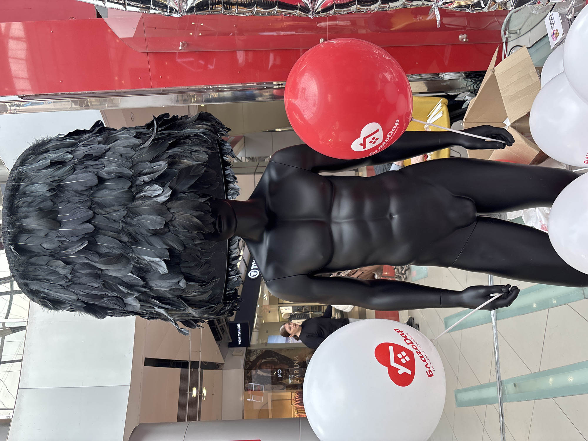 A black mannequin torso stands in a shopping mall in Izhevsk, Russia. The mannequin has a head covered in black feathers. A red balloon with a white logo floats above its right shoulder, and white balloons with the same logo flank its sides. The mannequins arms are outstretched and holding the strings from the balloons. The mall setting includes red walls, a silver reflective ceiling, a glass floor, storefronts for brands like Tom Tailor and Zarina, and a woman in black walking in the background. The logo on the balloons features a red heart encompassing a white house outline and the text "Благоддар". There is also a cardboard box and some other balloons behind the mannequin.