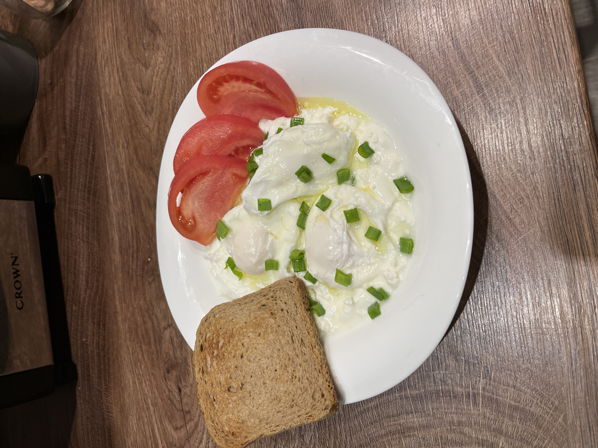 The scene depicts a prepared breakfast or meal situated on a dark brown wooden countertop in Samovodene, Bulgaria. The central subject is a white, round plate holding a serving of food. On the plate, three poached eggs are presented on a bed of white, granular curd, consistent with cottage cheese or strained yogurt, with visible drizzles of olive oil. The eggs and curd are garnished with chopped green onions. Adjacent to these, three thin, bright red slices of tomato are fanned out on the right side of the plate. To the left of the plate, a single slice of toasted whole-grain bread is positioned. In the upper background, a dark kitchen appliance with a metallic accent is partially visible, bearing the embossed brand name "CROWN." The wooden surface exhibits a distinct grain pattern and some minor surface wear.