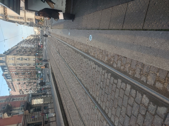 This image depicts an urban street scene at the Opéra tram stop (Lines A and D) in Strasbourg, France, looking northwest along Avenue des Vosges. In the foreground, two sets of dark grey tram tracks are embedded in a surface of dark grey cobblestones, some appearing wet. A narrow, light grey concrete median runs parallel to the tracks, separating them from a wider pedestrian platform on the right. This platform features a strip of light grey concrete adjacent to the tracks, followed by dark grey tactile paving with raised dots. Two circular, flush-mounted lights are visible in the concrete strip. In the midground, a wide street extends into the distance. On the left, a multi-story building constructed of red brick features numerous windows, balconies, and classical architectural details. A blue circular traffic sign and a light-colored public information kiosk are situated near this building. Several individuals are present: one person in dark clothing stands near the red building; two people are near the tram tracks in the middle distance, one appearing to push a stroller or similar wheeled object; and another person walks on the cobblestone surface towards the background. Overhead tram wires are faintly visible against the sky. The background reveals a long street lined with multi-story buildings exhibiting typical European urban architecture, primarily in shades of cream, beige, and light pink. These structures feature multiple windows and decorative elements. Various cars and light vehicles are visible on the distant street. On the far right, a person with long dark hair, wearing a dark coat, stands on the pedestrian platform, holding a white paper in their left hand and a mobile phone in their right. They are positioned next to a white structure, likely a tram shelter, which displays part of an advertisement with the visible text "LANCE". The sky above is a light blue with minimal cloud cover.