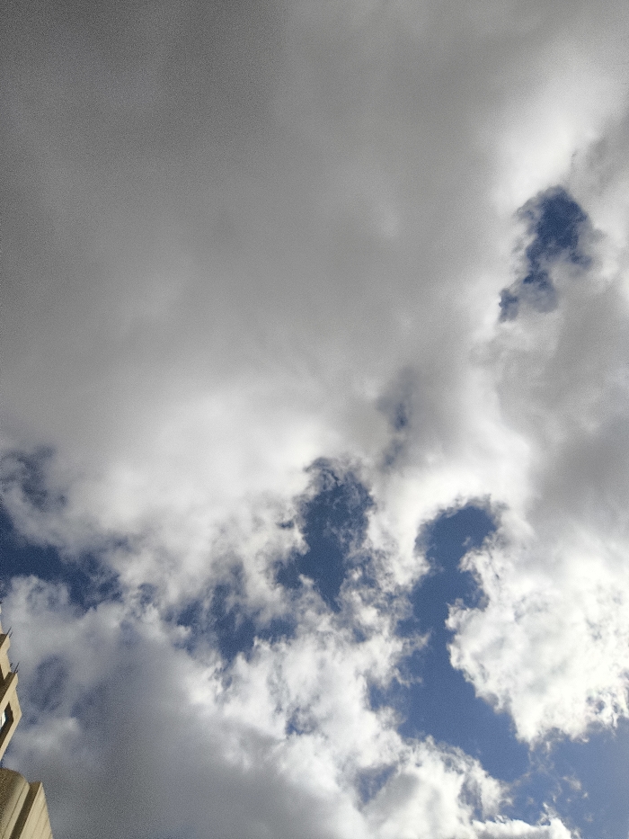 The image depicts an upward-angled view of a sky in Jirud, Syria. The sky is largely covered by a mix of stratocumulus and cumulus clouds, with significant variations in density and illumination. The upper left portion of the frame is dominated by a mass of dense, uniform grey cloud cover. Towards the lower right, the clouds appear whiter and more scattered, revealing several distinct patches of clear blue sky. In the lower-left corner of the frame, a portion of a light-colored, possibly beige or tan, multi-story building is visible. This structure exhibits a stepped or angled architectural design along its visible edges, and a dark, rectangular window opening is discernible on one of its facades. No individuals, actions, or specific interactions are depicted.