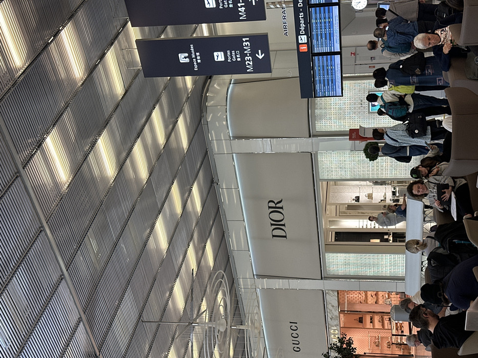 The image captures a scene inside Charles de Gaulle Airport in Paris, France