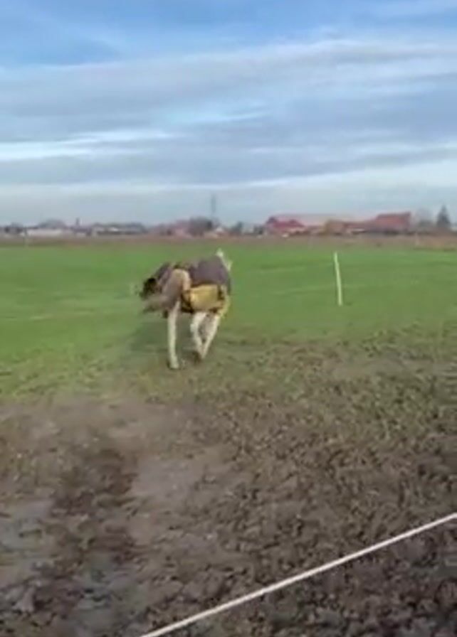 A donkey wearing a blanket trods through a muddy field towards a grassy area enclosed by white electrical fencing