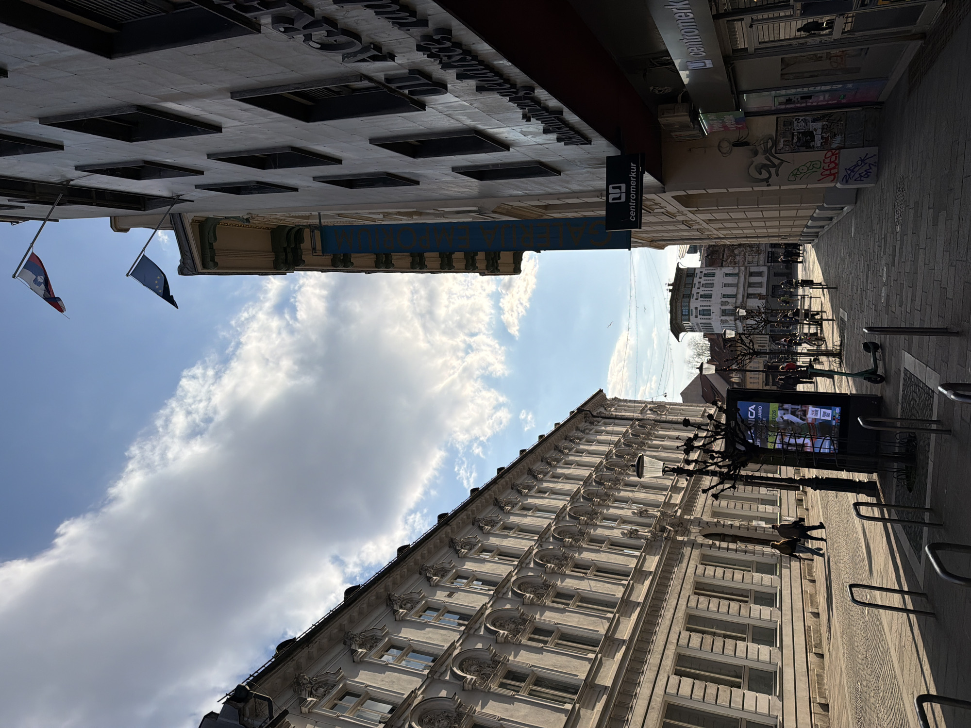 The image captures a street view in Ljubljana, Slovenia. The perspective is oriented upwards, showing buildings on either side of the street converging towards the center of the frame. The buildings are predominantly light-colored with ornate architectural details. A banner for 'Galerija Emporium' is visible hanging from one of the buildings. Flags of Serbia and Europe are prominently displayed. The street is paved and equipped with bike racks and digital advertising screens. Several people are walking along the street, captured in mid-stride. The sky is partly cloudy, with blue patches visible between the clouds.