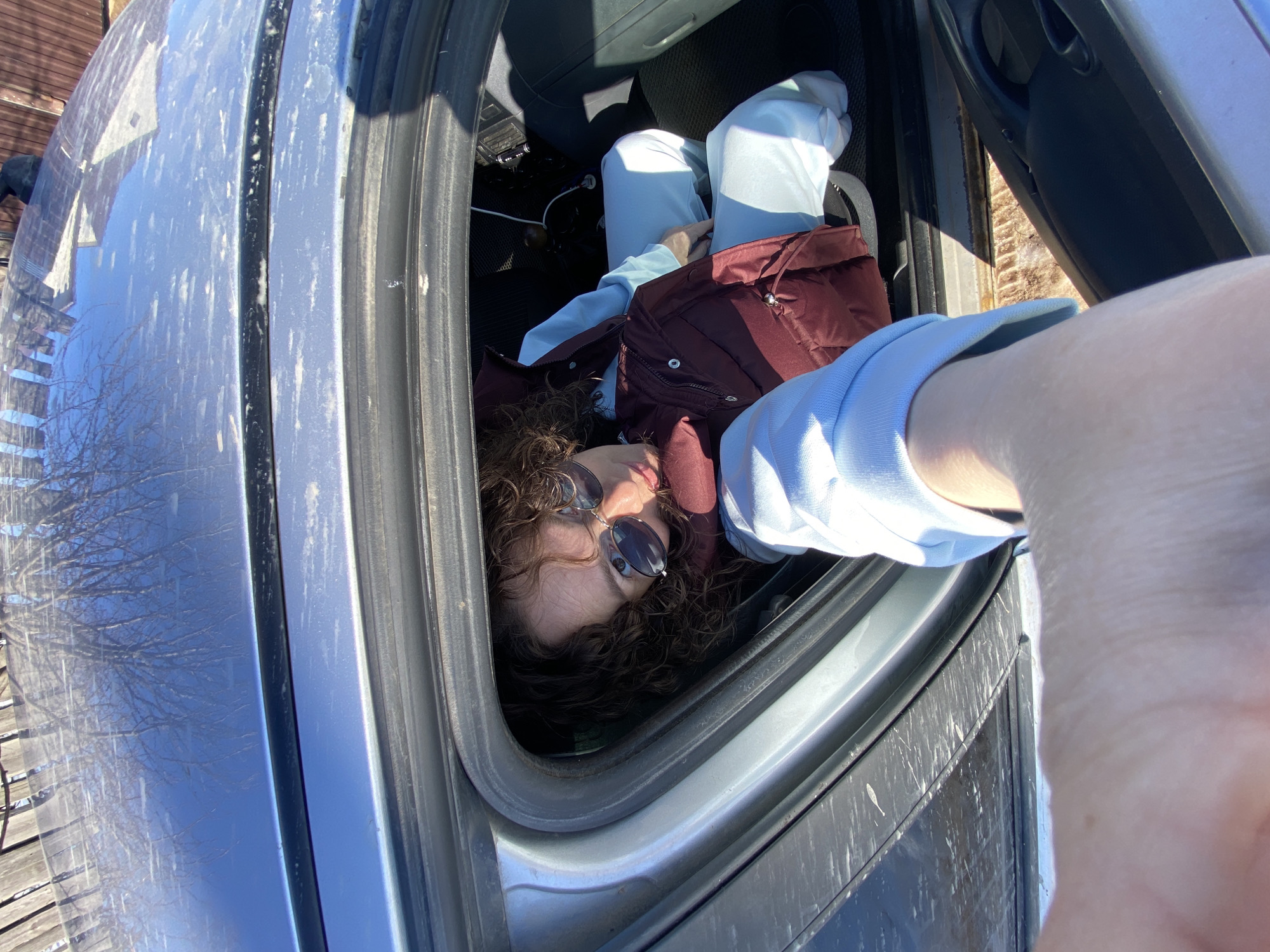 A high-angle selfie captures a female individual seated in the front passenger seat of a light gray four-door sedan, situated in Ольховка, Russia. The individual has dark, curly hair and wears round sunglasses, a light blue long-sleeved shirt, and a dark red sleeveless puffer vest. Her gaze is directed towards the camera, which is held by her extended arm, visible in the lower foreground wearing a light blue sleeve. The car's exterior, including the roof and upper side panels, is visibly dusty and streaked with dirt. Reflections on the vehicle's surface show a clear blue sky and bare tree branches, with a wooden fence partially visible. Inside the car, dark plastic interior elements are present, and a gear shifter knob along with a white charging cable are visible in the driver's footwell area. The ground visible through the open passenger door frame consists of dirt or dried earth.