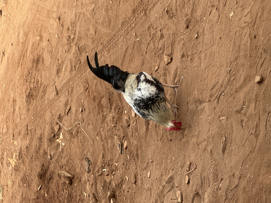 - "A black, white, and grayish-tan rooster is captured pecking at reddish-brown dirt ground in Nnobi, Nigeria" by FM-hlFko1, licensed under CC BY 4.0