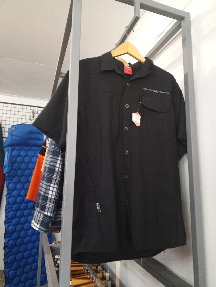 Within a retail environment in the city of Baza, Myanmar (Burma), a black short-sleeved collared shirt hangs from a wooden hanger on a grey metal display rack