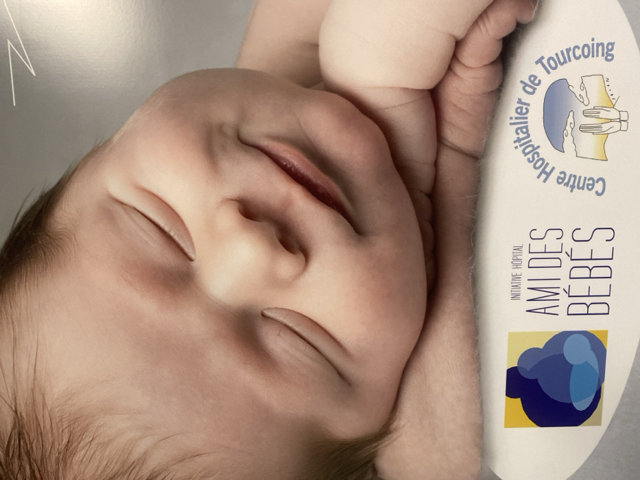 A sleeping baby's face rests against an adult's hand. The infant's eyes are closed, and the lips are slightly parted. Hair is visible at the forehead. Adjacent to the baby is a brochure or card with the words "AMI DES BÉBÉS," "Centre Hospitalier de Tourcoing," and an abstract design featuring shades of blue and yellow. The text indicates a baby-friendly initiative or hospital.