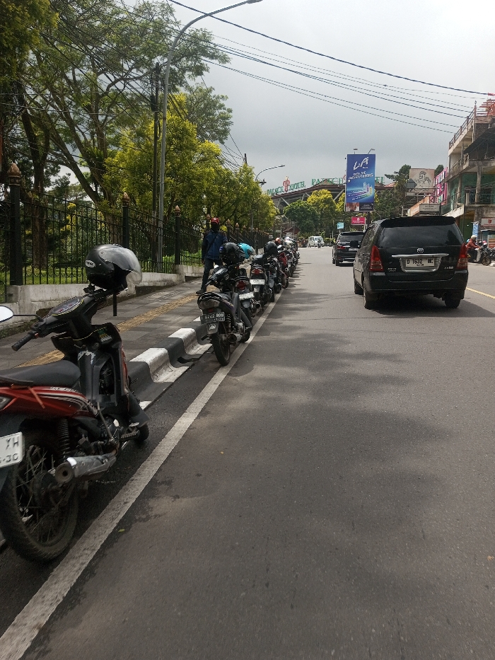 A street lined with parked motorbikes along a curb. A black SUV travels on the right side of the road. Trees and buildings stand in the background. An advertisement on a billboard can be seen in the distance. The sky is overcast.