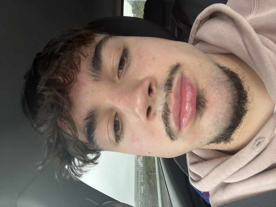 A young male individual, appearing to be in his late teens or early twenties, is captured in a close-up selfie from inside a vehicle