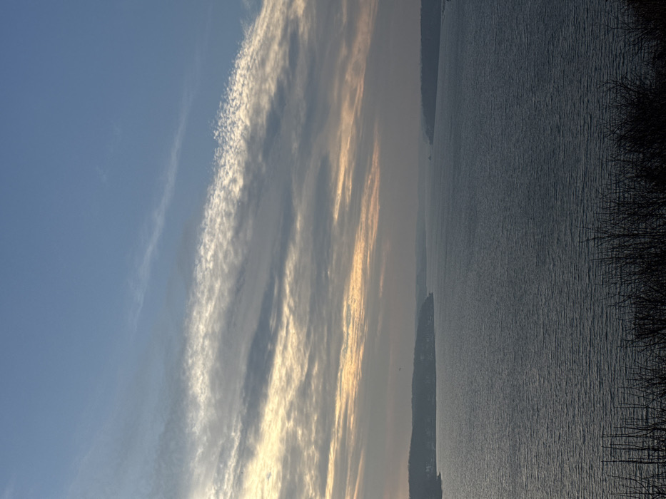 A serene image captures a tranquil body of water mirroring the sky above. Wispy clouds streak across the sky, tinged with soft hues of white, gray, and gold. A strip of land divides the water from the sky, creating a sense of depth and perspective. Silhouetted vegetation frames the scene, adding a natural border. The water's surface subtly reflects light, giving a shimmering effect.
