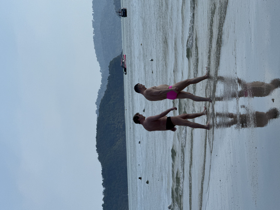 The image displays two adult males walking from left to right along the shoreline of Cenang Beach, Malaysia