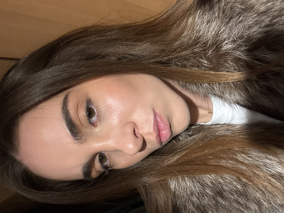 A close-up portrait shows a single female individual. The location in Paris, France, cannot be determined from the visual information present in the image; the background is a blurred, plain, warm-toned surface. The subject, likely in her twenties or thirties, occupies the central frame, looking directly into the camera with a neutral expression and slightly parted lips. She has long, dark brown hair parted off-center, thick dark eyebrows, and brown eyes. Her skin exhibits a noticeable sheen on the forehead, nose, and cheeks. She wears a light-colored, possibly white, ribbed top or undershirt beneath a thick, variegated fur coat or collar displaying shades of brown and grey. A thin gold-colored chain with a small pendant is visible around her neck. Direct frontal lighting illuminates her face.