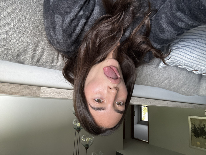 The image captures an indoor scene in a residential setting within the city of Unknown, Unknown. A young adult female with long, dark brown hair and brown eyes occupies the center-frame, visible from the upper torso. She is making a facial expression, extending her tongue from her mouth. She wears a dark gray, textured long-sleeved garment and is positioned against a light gray fabric sofa. A white pillow with thin blue horizontal stripes is partially visible on the sofa to her left. The background features a light-colored wall, traversed horizontally by a wooden partition with a light, two-toned grain. Above this partition, a framed artwork displaying dark, abstract figures is mounted on the left. To the right, a doorway with a dark frame leads to an adjacent room, revealing a bright area beyond. Three glass pendant light fixtures with exposed bulbs hang from the ceiling in the upper right quadrant.