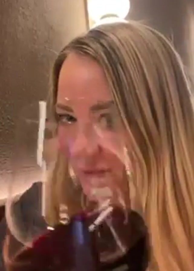 woman with blonde hair, who appears to be in her 30s, drinking red wine from a large glass