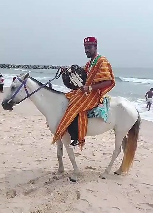 A man is riding a white horse on a sandy beach. The man is wearing a red cap, a colorful, striped robe, and black pants. He is holding a round, ornate object in his left hand. The horse has a brown tail and a blue bridle. In the background, there is an ocean with waves and a breakwater. There are also a few people standing on the beach in the distance. The sky is overcast.