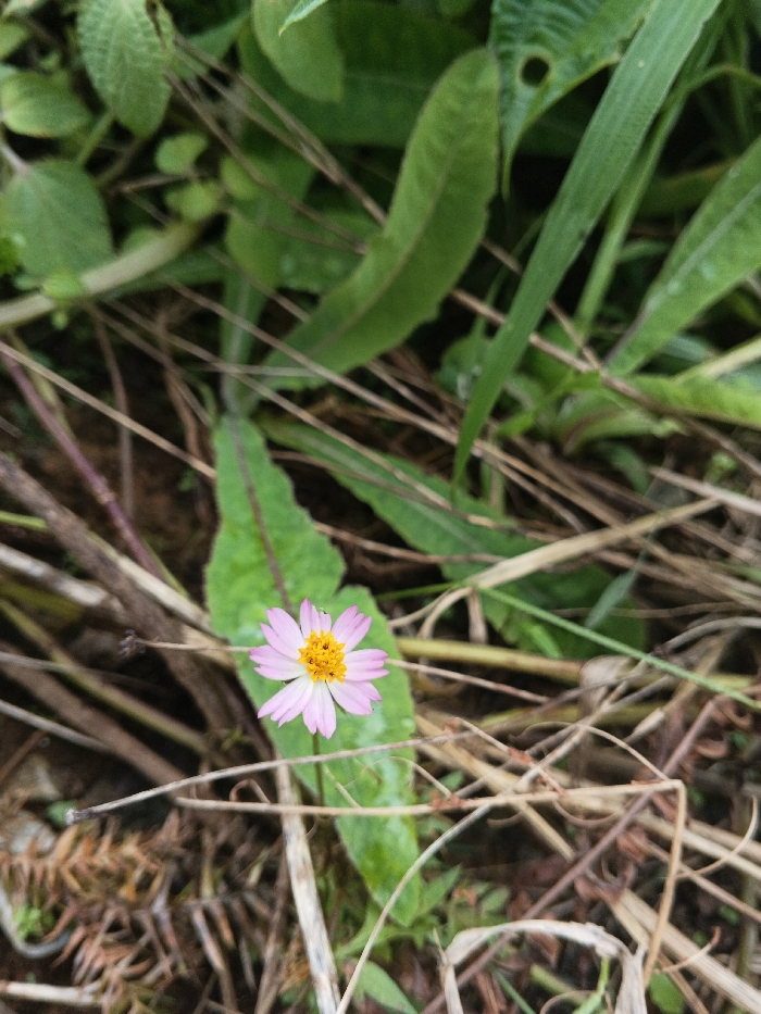 The image provides a close-up, ground-level view of a single flowering plant located in Candelaria, Philippines. The central subject is a small, composite flower with a dense yellow center surrounded by approximately eight to nine light pink ray florets. A minuscule, clear liquid droplet is visible on one of the pink petals. The flower is situated amidst a natural environment composed of various green leaves and blades of grass, interspersed with significant quantities of dried, brown, and reddish-brown plant stems and organic debris. The background consists of blurred green foliage. No individuals, animals, man-made objects, actions, or interactions are present within the frame. The scene is illuminated by diffused natural light.