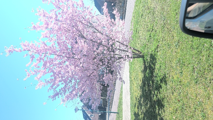 The image captures a residential street scene in Overloon, Netherlands, on a clear, sunny day. A mature deciduous tree, profusely covered in light pink blossoms, stands prominently in the center-left on a manicured patch of green grass. The tree casts a dark shadow onto the grass towards the lower left. To the left of the tree, a dark grey street light with a circular fixture is visible. A light-colored paved walkway or street curves from the lower left towards the right, separating the grassy area from the background. In the background, several residential houses with brick facades and dark roofs are partially visible, suggesting a suburban environment. The sky above is a uniform, bright blue, indicating clear weather. In the lower right corner, the black frame of a vehicle's side mirror is present, reflecting a distorted view of a light-colored vehicle. No individuals or specific actions are discernible within the frame.